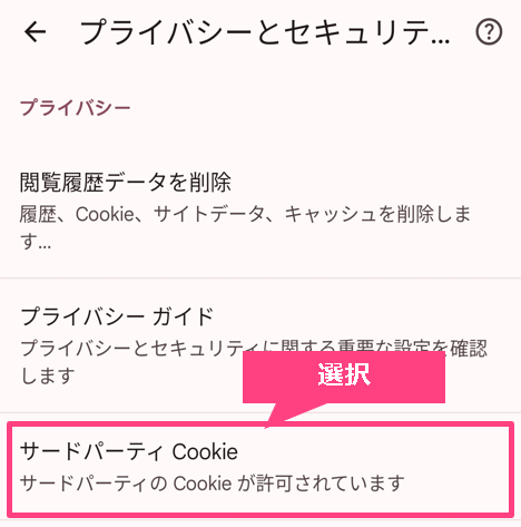 Androidをお使いの方は、Chromeブラウザの設定を確認してください。Chromeを開き、右上の「︙(3点メニュー)」→「設定」→「プライバシーとセキュリティ」→「サードパーティCookie」の順に進みます。