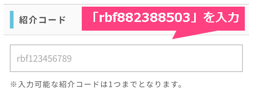 登録フォームの中に「紹介コード」または「友達紹介コード」の入力欄があります。ここに以下のコードを入力してください。この画面で入力しないと、後から追加することはできません。